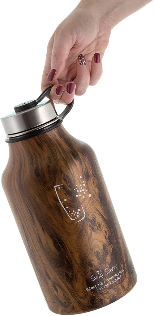 Il calore e le nuances del legno arricchiscono la grande bottiglia thermos di Swig Savvy. Con ben 1,9L di capienza, è adatta per portare le bevande fresche e calde durante le scampagnate all’aperto o durante i viaggi. Il tappo è convenientemente collegato alla bottiglia anche quando questa è aperta.