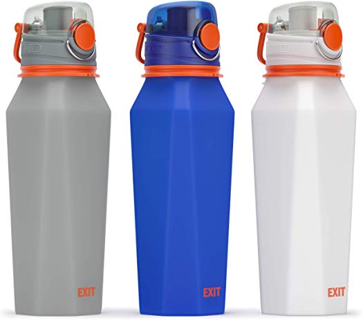 Ecco le borracce di EXIT, in 3 colorazioni differenti, il tappo garantito antiperdite a tenuta stagna e realizzate in silicone di altissima qualità , che non trasmetterà alle bevande nessun sapore. La borraccia è garantita senza BPA, e può sopportare temperature molto alte e molto basse, bisogna solo fare attenzione a non scottarsi, in quanto non è una bottiglia termica. Il suo design è stato pensato per permetterle di restare in piedi anche se è quasi vuota. Dotata anche di un pratico laccio per il trasporto, ha una capienza di 750 ml.