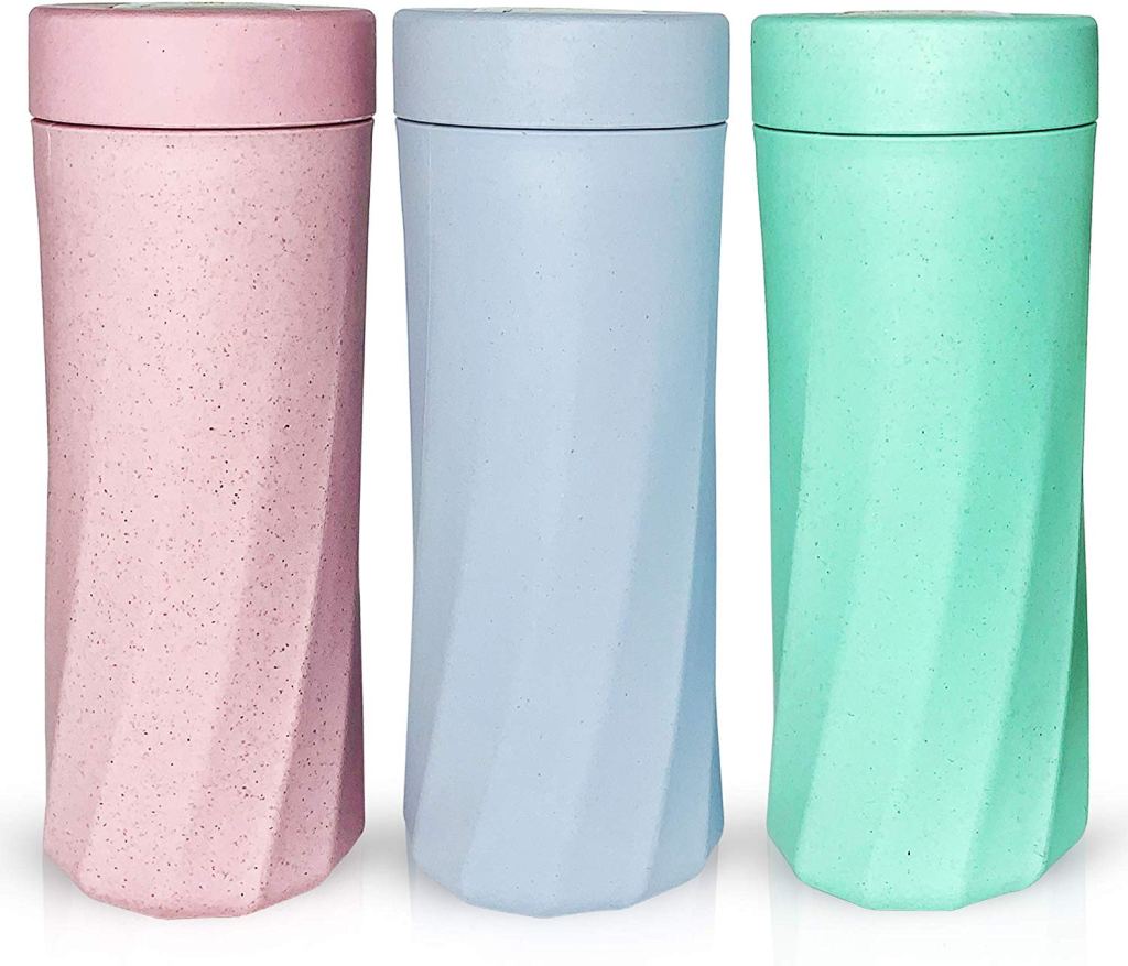 Il thermos di FJJ è realizzato in bioplastica di fibra di grano ed è disponibile in 4 colori pastello. Ha un laccetto per il trasporto e il tappo ha la guarnizione interna per evitare perdite.