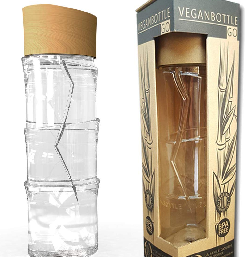 È leggera e trasparente la bottiglia Veganbottlego, realizzata in canna da zucchero. Ha una capienza di 500 ml e la sua produzione è totalmente eco sostenibile. La sua forma originale riprende la struttura della canna da zucchero e presenta una decorazione anche sul tappo.