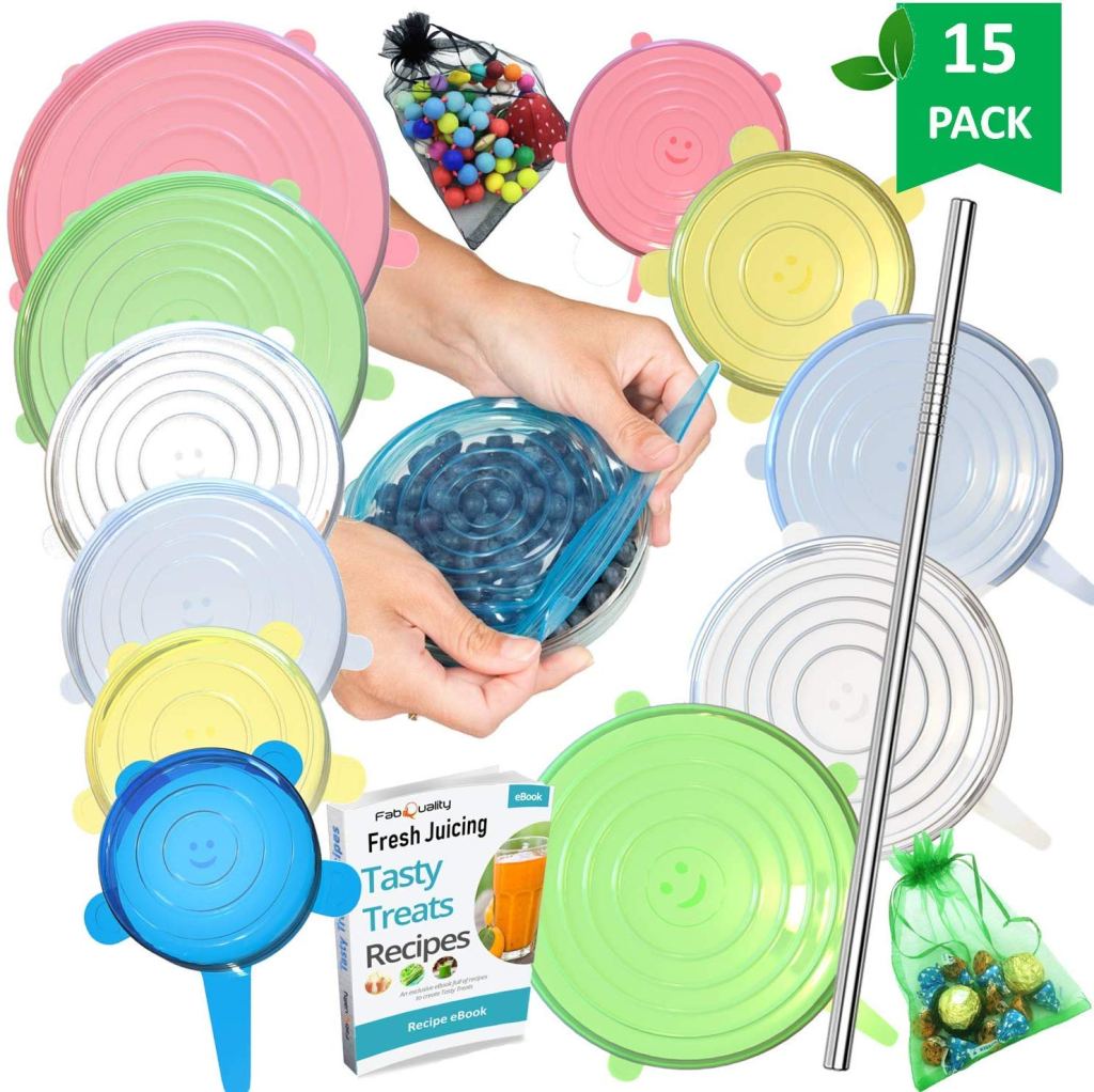 Infine, guardate che simpatici i coperchi in silicone estensibile colorati proposti da FabQuality nel pacco da 12. Anche questi possono essere ovviamente lavati in lavastoviglie e messi in microonde. La confezione inoltre contiene due sacchetti per caramelle e una pratica cannuccia in acciaio. Viene anche data la possibilità di scaricare un PDF gratuito (in inglese) con tantissime ricette per preparare succhi di frutta e smoothies.