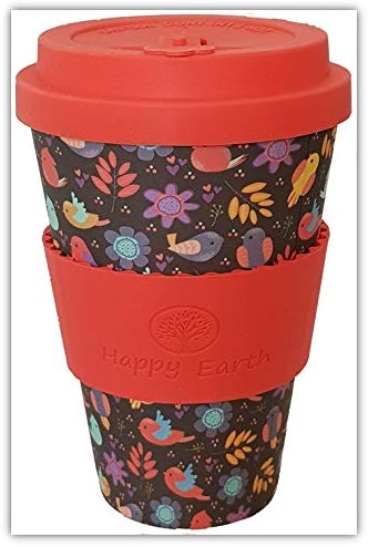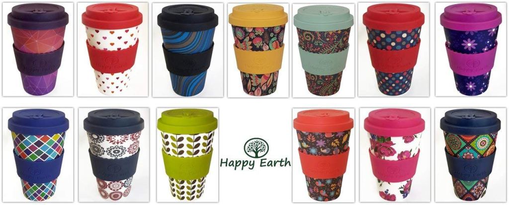 Ecco qui la tazza di Happy Earth, un prodotto certificato, realizzata in fibra di bamboo. Ha una capienza di ben 450 ml per permettere di trasportare anche il cappuccino più abbondante! È dotata di coperchio anti goccia e manichetta in silicone. I componenti in silicone possono essere lavati in lavastoviglie. E poi… quanti colori!