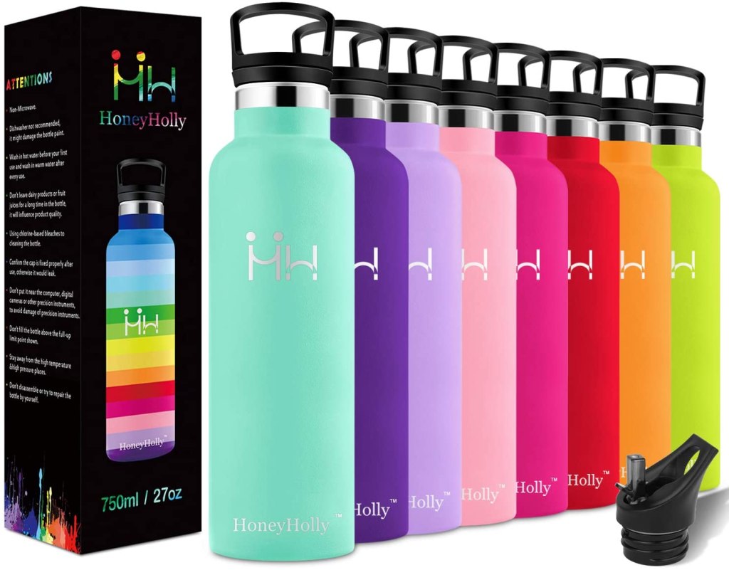 Sono coloratissime anche le borracce della HoneyHolly, che garantiscono un ottimo isolamento termico e sono disponibili in tante misure e colori diversi. Sono, come le altre bottiglie termiche presentate in questo articolo, antigoccia e realizzate con materiali di qualità.
