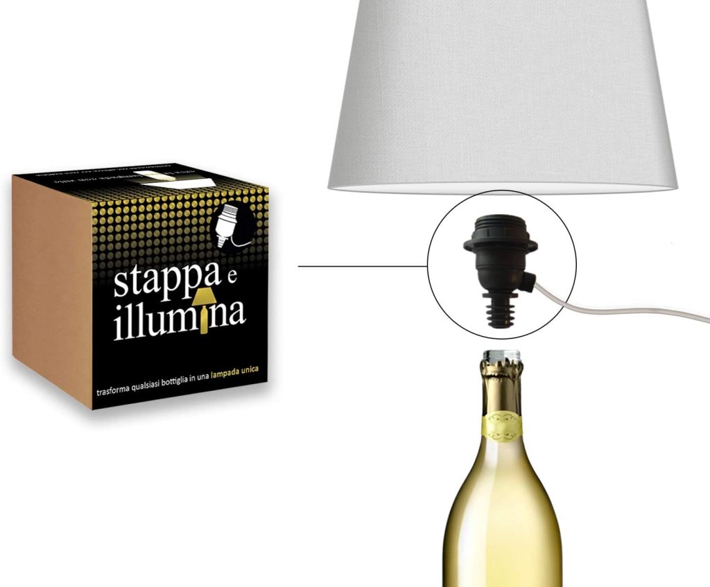 Per ultimo… ecco una curiosità. Vi è mai successo di avere una bottiglia di liquore o vino talmente bella che vi viene spontaneo dire: “Questa non la butto… ci voglio fare una lampada!” Spesso, però, finiamo col lasciar perdere, in quanto dobbiamo trovare il portalampada giusto, il cavo, ecc ecc. Per questo hanno inventato un simpatico gadget che si chiama “Stappa e Illumina”. È un portalampada completo di cavo e interruttore, che si adatta perfettamente al collo delle bottiglie.